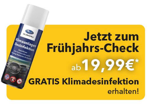 * Die Aktion ist gültig vom 08.04.2026 bis 12.06.2026 nur bei teilnehmenden Subaru Partnern und wird gemeinsam von der SUBARU Deutschland GmbH und den teilnehmenden Subaru Partnern getragen und ist mit anderen Aktionen der SUBARU Deutschland GmbH kombinierbar. Der Aktionspreis i.H.v. 19,99 € versteht sich als unverbindliche Angebotspreisempfehlung des Importeurs inkl. MwSt. und beinhaltet den Frühjahrs-Check gemäß Checkliste (zzgl. Aufwand und Material für mögliche Zusatzarbeiten z. B. das Auffüllen von Flüssigkeiten o. ä. nach Bedarf und Absprache). Zusätzlich erhalten Sie eine Dose Klimaanlagen-Desinfektion ohne Berechnung. Weitere Detailinformationen erhalten Sie bei Ihrem teilnehmenden Subaru Partner oder unter www.subaru.de.